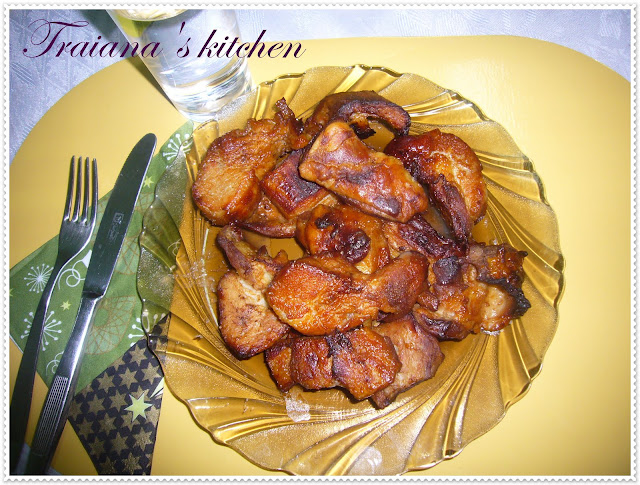 Нарежете месото на квадратни парченца, но не прекалено малки. Овкусете ги с подправките. Разбъркайте меда с горчицата и оваляйте месото в тази смес. Поставете в тава и залейте с виното и вода, да се покрие месото. Печем на 200 градуса около 30 минути. Обръщаме месото, за да се запече и от другата страна. Поднасяме с гарнитура по избор.